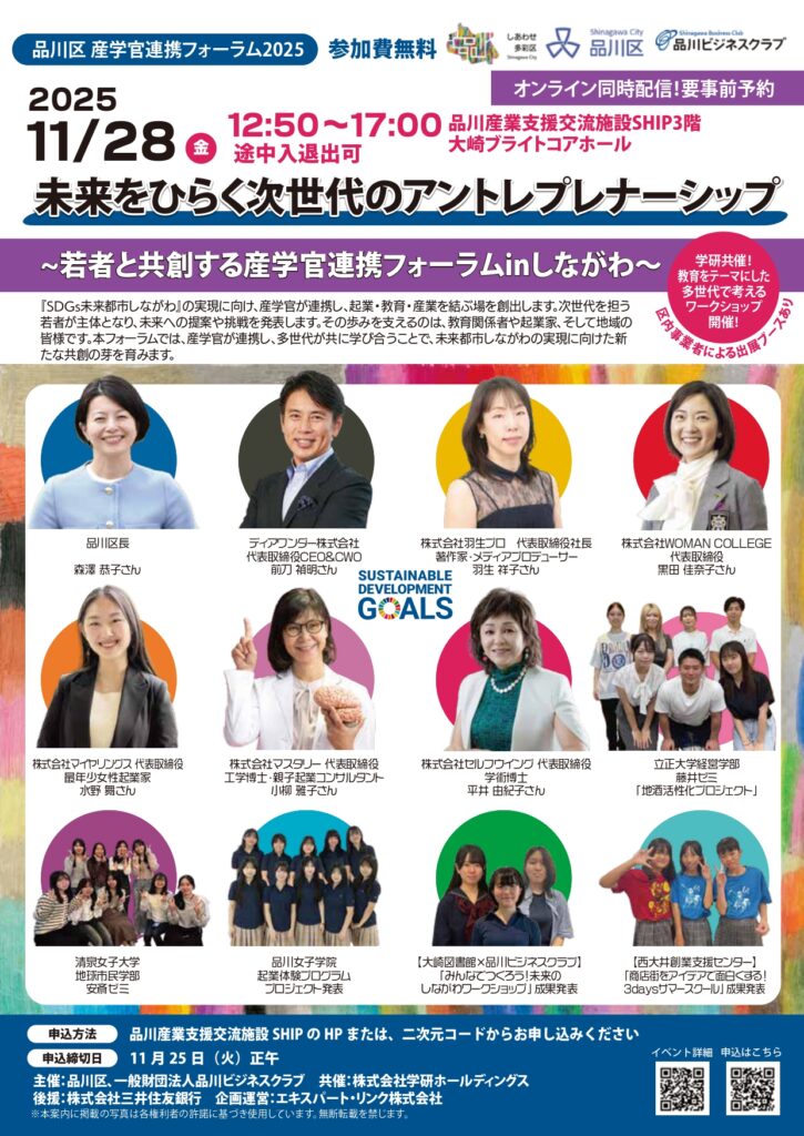 本フォーラムは、「SDGs未来都市しながわ」の実現に向けた産学官連携の一環として、起業・教育・産業をつなぐ場を創出し、地域に根ざした新たなイノベーションエコシステムを構築します。また、ジェンダー平等や若者のエンパワーメントを推進する場として、区内の学校や大学との連携を強化し、次世代リーダー育成を促進します。