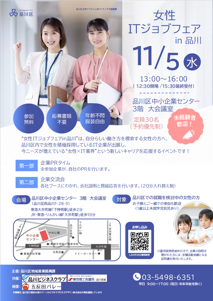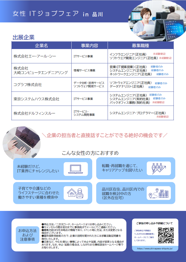 2回目の今回は、品川区内で女性を積極採用しているIT企業と、区内での就業を検討中の女性とのキャリアマッチング交流会を開催します。IT未経験者も大歓迎ですので、ぜひ実際に働いている社員の方からお話を聞いてみませんか。